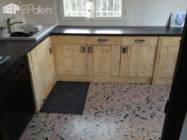 Nicolas sent us some photos of his brand new kitchen entirely made from upcycled wood pallets and for a cost around 200€ (approx. 260$)! Good job Nicolas!